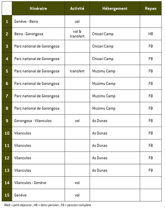 * A Gorongosa, les safaris non privatifs (généralement deux par jour) avec guide anglophone